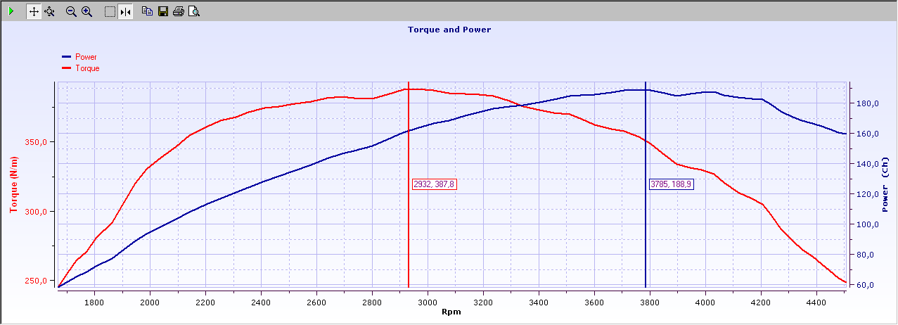 Aquí la gráfica de potencia. En rojo el par motor y en azul la potencia.